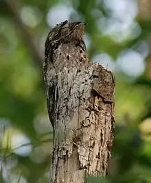 Un ibijau gris (Nyctibius griseus), le plus commun de la famille des nyctibiidés, peut utiliser son plumage cryptique pour simuler de manière extrêmement efficace un tronc d'arbre.