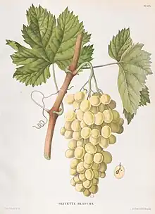 OLIVETTE BLANCHE ( Provence et Languedoc ). Ses raisins sont, ainsi que ceux des variétés suivantes , très - lâches ; par conséquent les grains sont rares et très écartés le long d'une longue grappe. La maturité du raisin est un état difficile à obtenir pour tout les raisins de cette tribu, à une seule exception près.