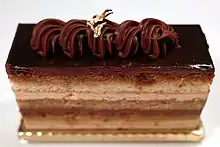 - (Pâtisserie) Pâtisserie au chocolat et au café, constituée d’une succession de biscuits Joconde imbibés d’un sirop au Grand Marnier ou au cointreau, de ganache et de crème au beurre, recouvert par un glaçage au chocolat.
