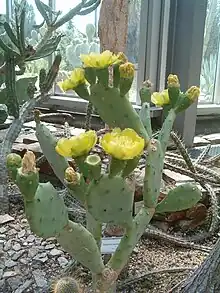 - (Botanique) Espèce d’oponce, grand cactus originaire de l’Amérique centrale, buissonnant, aux raquettes (cladodes) ornementées d’aréoles rares, à fleurs jaunes et aux fruits comestibles.