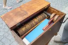 Vue du cylindre à came et du soufflet d'un orgue tonneau.
