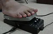 - Appareil de plastique ou de métal posé au sol, branché entre la sortie audio d'un instrument électrique (généralement une guitare) et l'amplificateur, qui est actionné avec le pied pour modifier le son.