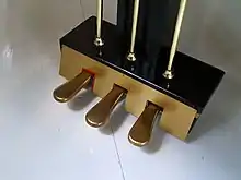 - Sur un piano, langue de bois ou, plus souvent, de métal placée sous l’instrument et sur laquelle on appuie avec le pied pour modifier le son. Note : Il y en a normalement deux → voir sourdine.