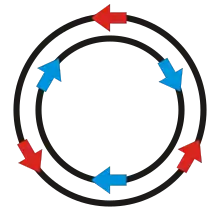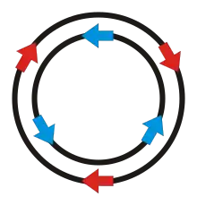 Dans la francophonie et dans beaucoup d’autres pays, le périphérique intérieur est dans le sens des aiguilles d’une montre (bleu).