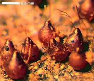- (Mycologie) Formation reproductrice (ascocarpe) particulière à certains champignons ascomycètes et lichens en forme d’urne ou de bouteille et ouverte à son sommet par une ostiole.