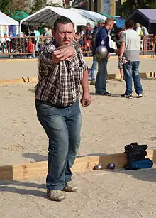 pétanqueur \pe.tɑ̃.kœʁ\ masculin (pour une femme, on dit : pétanqueuse)