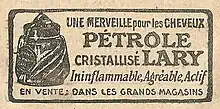 Réclame pour le Pétrole cristallisé Lary (lotion capillaire), en 1921.