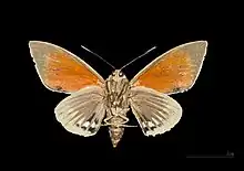 - (Zoologie) Grand insecte lépidoptère (papillon) de nuit à activité diurne de la famille des castnidés (Castniidae) dont les ailes antérieures sont vert-bronze foncé striées de brun, et les ailes postérieures rouge orangé brillant avec des marques grasses noir et blanc, originaire d’Amérique du Sud et introduit en Europe.