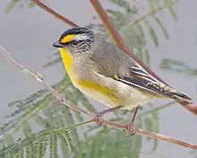 - Espagnol : pardalote estriado (es) masculin, pardalote de puntas amarillas (es)