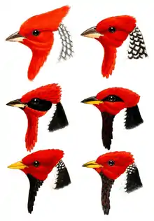 - (Ornithologie) Genre de passereau à huppe érectile écarlate plus ou moins fournie bordée de blanc, comprenant six espèces appartenant à la famille des thraupidés (e.g. tangaras, callistes, etc.) ayant l'aspect de cardinaux (mais sans parenté taxinomique) et fréquentant les forêts tropicales et subtropicales clairsemées de l'Amérique latine (genre Paroaria).