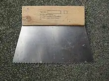 - (Maçonnerie, Tapisserie, Outillage) Lame de métal crantée, destinée à étaler de la colle (colle à carrelage, colle à revêtement mural, etc.). Les crans permettent un meilleur étalement de la colle sous forme de stries et permettent sa bonne répartition sur les surfaces irrégulieres.