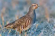 La perdrix grise (Perdix perdix) est l'espèce-type de la sous-famille des perdicinés, qui inclut un grand nombre d'espèces de gallinacés d'Eurasie et d'Afrique.