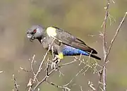 - (Ornithologie) Perroquet de taille modeste, au plumage gris, avec du jaune et du bleu, que l'on trouve de l'Angola à la Namibie.
