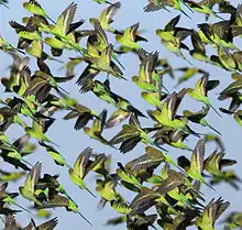 - Perruche australienne du genre Melopsittacus, vivant en bande nombreuse à l'état sauvage, très fréquemment élevée en captivité.