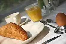 | petit déjeuner continental \pə.ti de.ʒœ.ne kɔ̃.ti.nɑ̃.tal\ |