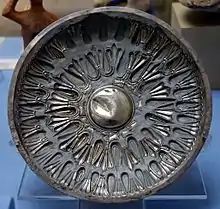 - Coupe ronde sans pied en forme d’assiette utilisée pour le culte ou les rituels. Elle présente en général une saillie en son centre, représentant l’ombilic.