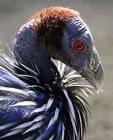 - (Ornithologie) Espèce d’oiseau gallinacé, une pintade sauvage d’Afrique de l'Est à tête nue comme un vautour et bleue chez l’adulte.