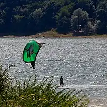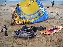 - (Sports de glisse) Ensemble constitué d’une planche nautique munie de fixations pour les pieds, d’un harnais de traction fixé au corps, de suspentes et d’une voile dérivée du cerf-volant, conçu pour permettre d’évoluer en faisant des bonds acrobatiques au-dessus des vagues.