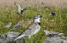 - (Ornithologie) Espèce de passereau de la famille des calcariidés, nidifiant dans les prairies du Canada et des États-Unis. Le mâle se distingue par une bavette et une petite calotte noires.