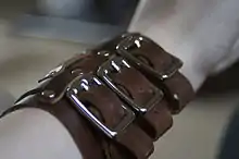 - Bracelet en cuir ou en étoffe que portent certains travailleurs de force ou sportifs pour soutenir leur poignet.