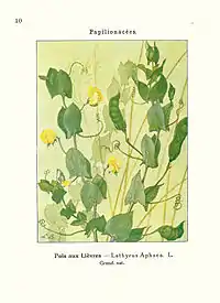 — (L’Industrie laitière, SCEES, vol. 38, 1913, page 575)La plante qui infeste votre jeune luzerne et que vous appelez plat-pois est la Gesse sans feuilles (Lathyrus aphaca), vulgairement appelée Reluiseau, Pois de serpent, Pois aux lièvres. Les feuilles sont réduites à l’état de vrilles et les organes foliacés vert, en forme de fer de flèche sont les stipules.