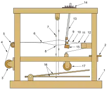 - Pièce du métier de rubannerie en forme de traverse sur laquelle l’ouvrier appuie sa poitrine. [1]