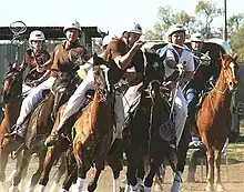 - Jeu d’équipe à cheval, mélange de polo et de crosse, se jouant sur une surface en herbe de la taille d’un terrain de football, avec une crosse (raquette équipée d’un filet) pouvant porter ou lancer une balle en caoutchouc d'environ 20 cm de diamètre.