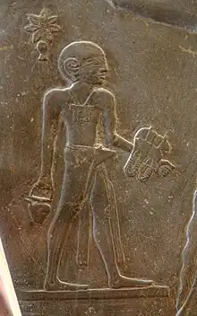 Palette de Narmer : le porte-sandales apparaît sur chacune des faces, près du pharaon.