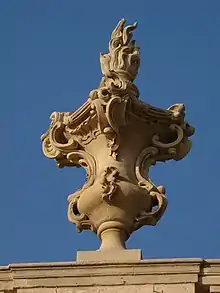 - (Ornement) Ornement composé d’un vase en pierre surmonté d’une flamme.
