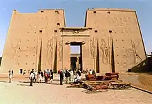 - (Architecture) Double massif de pierre, en forme de pyramide tronquée, qui, dans les temples de l’ancienne Égypte, encadrait la principale porte d’entrée.