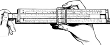 - (Technique) Instrument de calcul analogique, composé de deux réglettes coulissantes, qui permet d’effectuer des opérations arithmétiques de multiplication et de division, les calculs trigonométriques et logarithmiques, ainsi que le calcul de racines carrées et cubiques, par lecture directe sur le curseur.