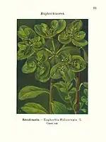 — (Henri Gaussen, Géographie des Plantes, Armand Colin, 1933, p.110)Euphorbe réveil-matin. — Nom vulgaire : Réveil-matin. — Nom latin : Euphorbia helioscopia'