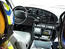 Poste de conduite d’une ambulance avec un radiotéléphone mobile.