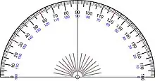 - (Géométrie) Instrument, le plus souvent en forme de demi-cercle gradué, servant à mesure les angles tracés sur le papier, ou avec lequel on rapporte sur le papier les angles mesurés sur le terrain avec un goniomètre.