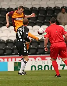- (Football) Tir effectué en frappant le ballon alors qu’il est en l’air, sans attendre qu’il ait touché le sol.