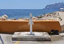 - Douche sommaire, avec généralement uniquement de l’eau froide, installée en bordure des plages pour permettre d’enlever avec de l’eau le sable que l’on a sur les pieds, il est aussi possible de s’y doucher entièrement si le dispositif est fixé assez haut. Parfois, il s’agit d’un simple robinet, parfois l’eau y est chauffée par un dispositif solaire.