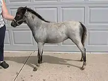 Rouan cap-de-maure, a la tête et les extrémités noires, et le reste du corps rouan