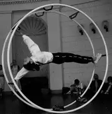 - (Cirque) Sorte d’agrès de cirque composé de deux tores métalliques reliés l’un à l’autre dans lequel l’artiste s’accroche à l’aide de ses pieds et de ses mains et évolue dans l’objet en rotation.