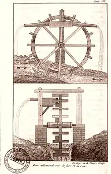 — (William Tatham, Traité général de l’irrigation, traduit de l'anglais par De R…, Paris : chez Meurant, an XI (1803), p. 34)On se sert beaucoup en Amérique, pour arroser les terres , d’un mécanisme fort simple, que l’on nomme roue allemande. Cette roue est armée d’aubes qui reçoivent la force du courant et mettent la machine en mouvement. […]. La roue est en outre garnie de boîtes ou godets (3,3,3,3,) qui se remplissent d’eau en passant dans le courant, et qui viennent la verser dans les chenets (2,2,) qui sont disposés de manière à la recevoir et la conduire sur les terrains à arroser.
