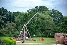 Un trébuchet fonctionnant grâce à une roue de carrier (château de Warwick).