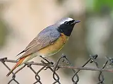 - (Ornithologie) Espèce de petit oiseau passereau de l'Ancien Monde qui a la queue d’un roux marqué et dont le mâle a un masque noir, un front blanc et une poitrine orangée.