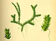 - (Botanique) Plante cryptogame vasculaire voisine des mousses ayant généralement une tige ramifiée par bifurcations successives, portant des racines et de nombreuses petites feuilles entières disposées sur quatre rangs le long des rameaux.