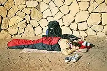 - Grand sac garni de duvet dans lequel on se glisse pour dormir et pour lutter contre les intempéries et le froid