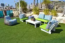- (Par métonymie)(Mobilier) Ensemble de meubles, chaises, fauteuils, table, tapis, destinés à être utilisés en plein air, et non pas exclusivement dans un jardin. Il est généralement fabriqué en matériaux qui ne craignent pas l’humidité : métal, kapok, tissus imputrescible, rotin, certains bois, plastique, etc.