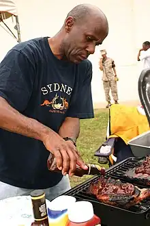 Cuisinier mettant de la sauce barbecue sur une viande grillée.