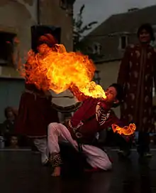Un spectacle de rue avec un cracheur de feu et des musiciens.