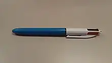 - Stylo à bille possédant quatre mines de quatre couleurs différentes (généralement noir, bleu, vert, rouge). Un mécanisme permet d’utiliser au choix l’une des quatre couleurs d’encre que propose le stylo.
