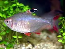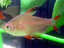 - (Ichtyologie) Nom donné en aquariophilie à une espèce de petit poisson sud-américain : Hyphessobrycon rosaceus.