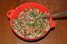 - (Cuisine) Salade de fines herbes hachées, agrémentée de quelques grains de boulghour gonflés dans un mélange d'huile d'olive et de jus de citron, avec divers ingrédients rajoutés selon le gout du cuisinier : tomates, oignons, menthe, olives, etc.