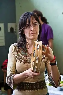 - (Musique) Petit tambour qui n’a qu’un fond de peau tendue sur un cercle de bois de quelques centimètres, autour duquel il y a des plaques de cuivre et des grelots, et dont on joue avec le bout des doigts ou en l’agitant.